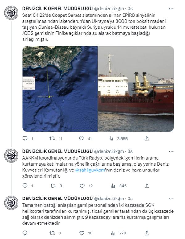Ulaştırma ve Altyapı Bakanlığı Denizcilik Genel Müdürlüğü'nün sosyal medya hesabından yapılan açıklamada, "Saat 04.22'de Cospat Sarsat sisteminden alınan EPİRB sinyalinin araştırılmasından, İskenderun'dan Ukrayna'ya 3000 ton boksit madeni taşıyan Guniea- Bissau bayraklı Suriye uyruklu 14 mürettebatı bulunan JOE 2 gemisinin Finike açıklarında su alarak batmaya başladığı anlaşılmıştır. AAKKM koordinasyonunda Türk Radyo, bölgedeki gemilerin arama kurtarmaya katılmalarına yönelik çağrılarına başlamış, olay yerine Deniz Kuvvetleri Komutanlığı ve @sahilguvkom'nın deniz ve hava unsurları görevlendirilmiştir. Tamamen battığı anlaşılan gemi personelinden iki kazazede Sahil Güvenlik Komutanlığı helikopteri tarafından kurtarılmış, ticari gemiler tarafından da üç kazazede sağ olarak denizden alınmıştır" denildi. (DHA)