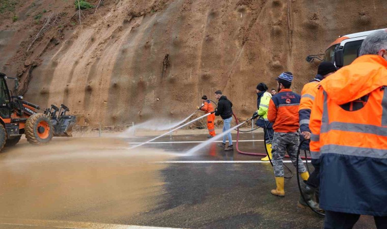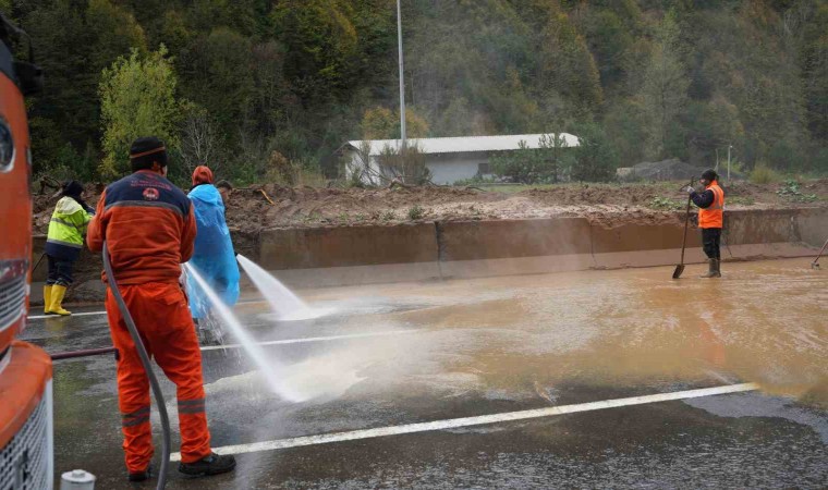 Anadolu Otoyolu’nun Bolu Dağı Tüneli çıkışında meydana gelen heyelan riski nedeniyle dün akşam saatlerinde ulaşıma kapatılan İstanbul yönünün ulaşıma açılması için sabahın erken saatlerinde bölgeye gelen karayolları ekipleri, yola akan çamurları temizleyerek yolu 2 şeritten trafiğe açtı.