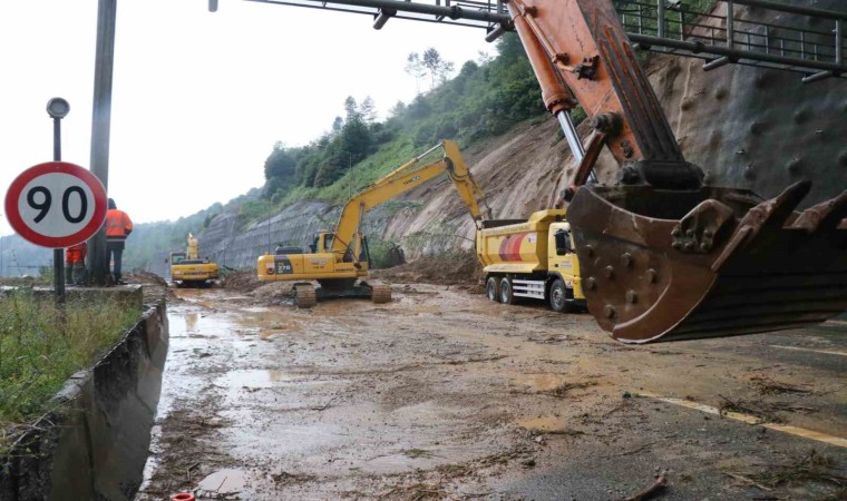 Batı Karadeniz bölgesini vuran yoğun yağışlar, Düzce ve Bolu bölgelerini de etkisi altına aldı. Dün akşam saatlerinde Bolu Dağı Tüneli çıkışında meydana gelen heyelan, TEM Otoyolu'nun İstanbul istikametini etkiledi. Heyelan sonucunda yol trafiğe kapatıldı ve temizleme çalışmaları hemen başladı. Çalışmalar sabahın aydın saatlerinde tekrar hız kazandı. Ekipler, iş makineleriyle yolda biriken heyelan malzemelerini temizlemeye çalışıyorlar.
