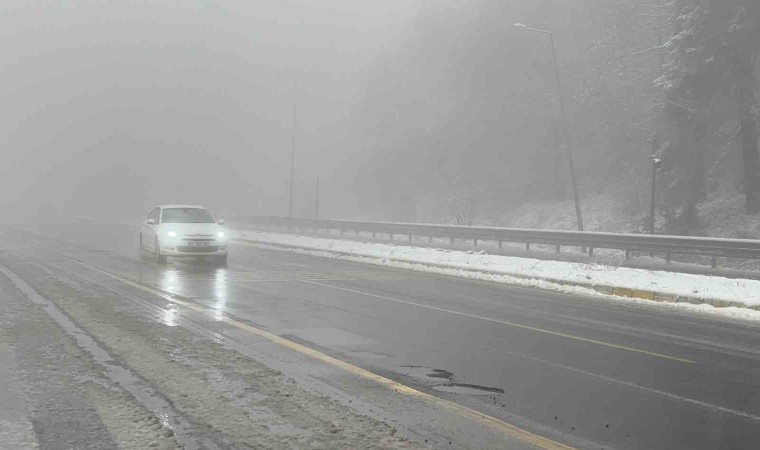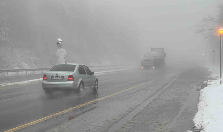 D-100 kara yolunun Bolu Dağı geçişinde etkili olan hafif kar yağışı ve sis sebebiyle görüş mesafesi yaklaşık 30 metreye kadar düştü.