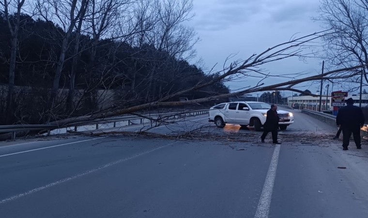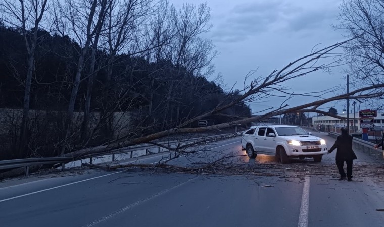 Bolu-Mudurnu karayolunda yaklaşık 10 metre uzunluğundaki ağaç devrilerek yolu trafiğe kapattı.