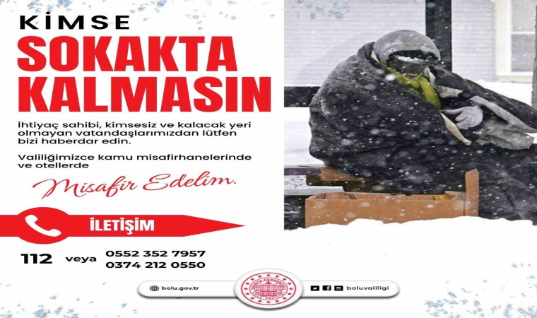 Bolu’da soğuk havaların etkisini hissettirmeye başlamasıyla birlikte Bolu Valiliği tarafından ‘Kimse Sokakta Kalmasın’ sloganıyla yürütülen proje başlatıldı. Valiliğin sosyal medya hesaplarından yapılan çağrıda, ihtiyaç sahibi, kimsesiz ve kalacak yeri olamayan vatandaşların valiliğe veya 112 Acil Çağrı Merkezi’ne bildirilmesi istendi.