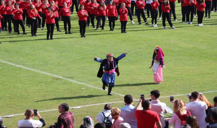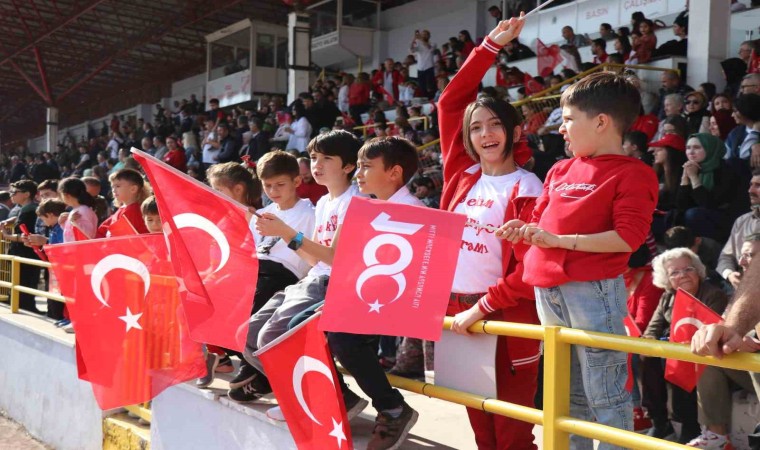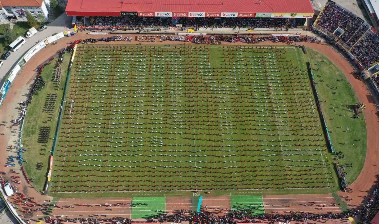 Muhteşem görüntülere sahne olan stadyumda yöresel halk oyunları, mehter gösterisi ve zeybek oyunu oynandı. İki ilkokul öğrencisinin zeybek oynayışı ise kutlama törenine katılan 15 bin kişi tarafından dakikalarca alkışlandı. Stadyuma dizilen bin 923 kişi ile dev harmandalı gösterisi yapıldı. Dronla görüntülenen muhteşem gösteride bin 923 kişi kıyafetleriyle ‘100. yıl’ yazısını oluşturdu.
