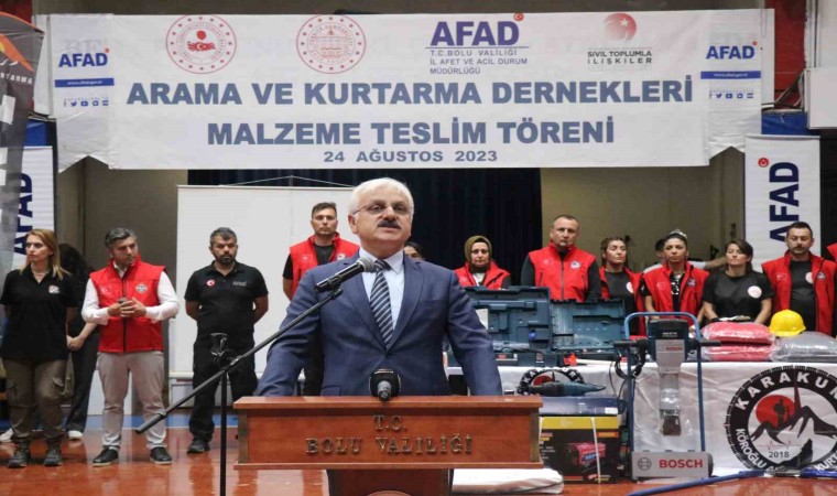 17 Temmuz Spor Salonu’nda düzenlenen malzeme teslim törenine Bolu Valisi Erkan Kılıç, AFAD Sivil Toplumla İlişkiler ve Rehabilitasyon Daire Başkanı Abdulkadir Tercan ile daire müdürleri ve arama kurtarma ekipleri katıldı.