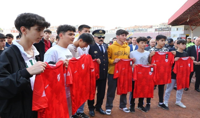 Boluspor-Bodrumspor maçı öncesinde Bolu İl Emniyet Müdürlüğü ekipleri, Cumhuriyetin 100. yılına özel 100 öğrenciye Boluspor forması dağıttı.