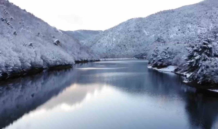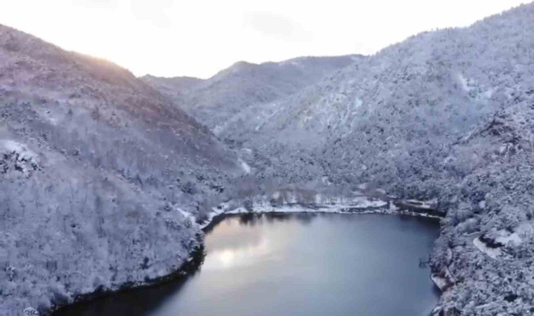 Amasya’nın doğal güzelliğiyle ünlü Boraboy Gölü’nün etrafı yağan karla beyaza büründü. Kartpostallık manzara havadan dron ile görüntülendi.