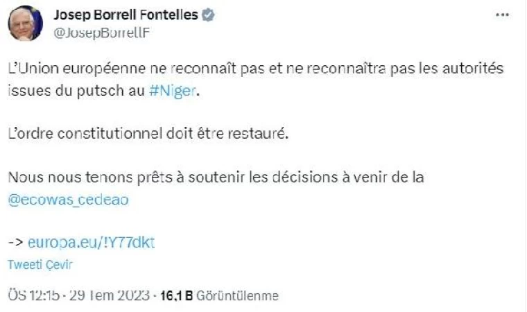 Borrell, “Avrupa Birliği, Nijer'deki darbe sonucu ortaya çıkan yetkilileri tanımıyor ve tanımayacak. Başkan Bazoum demokratik olarak seçildi ve bu nedenle Nijer'in tek meşru Cumhurbaşkanı olmaya devam ediyor. Koşulsuz ve gecikmeksizin serbest bırakılmalıdır. AB, Başkanın ve ailesinin güvenliğinden darbecileri sorumlu tutuyor. Darbecilerin anayasanın askıya alındığını ve demokratik kurumların tasfiye edildiğini ilan etmeleri huzuru, istikrarı ve güvenliği korunması gereken Nijer devletini ve halkını zayıflatmaktadır” ifadelerine yer verdi.