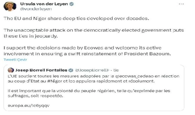 Avrupa Komisyonu Başkanı Ursula von der Leyen de Borrell’in açıklamasını alıntılayarak, “AB ve Nijer, on yıllar boyunca gelişen derin bağları paylaşmaktadır. Demokratik yollarla seçilmiş hükümete yönelik kabul edilemez saldırı bu bağları tehlikeye atmaktadır. ECOWAS tarafından alınan kararları destekliyor ve Başkan Bazum'un hızlı bir şekilde görevine iade edilmesini sağlamak üzere aktif katılımını memnuniyetle karşılıyorum” açıklamasında bulundu.