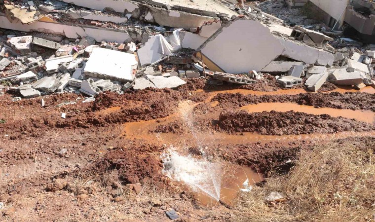 Kahramanmaraş’ta meydana gelen depremler sonrası yıkımı devam eden ağır hasarlı binaların etrafındaki boruların patlaması sonucu içme suları boşa aktı.