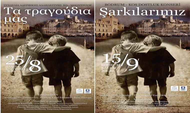 Bodrum ve Kos arasındaki iyi ilişkilerin daha da güçlendirilmesi amacıyla iki yakada da ’Şarkılarımız’ Kos Bodrum Dostluk Konseri düzenlenecek. Konser etkinliklerinin ilk ayağı, 25 Ağustos Cuma günü saat 20.30’da Kos Barış Meydanı’nda gerçekleştirilecek. Konserde Türkçe ve Yunanca şarkılar seslendirilerek dostluk mesajları verilecek.