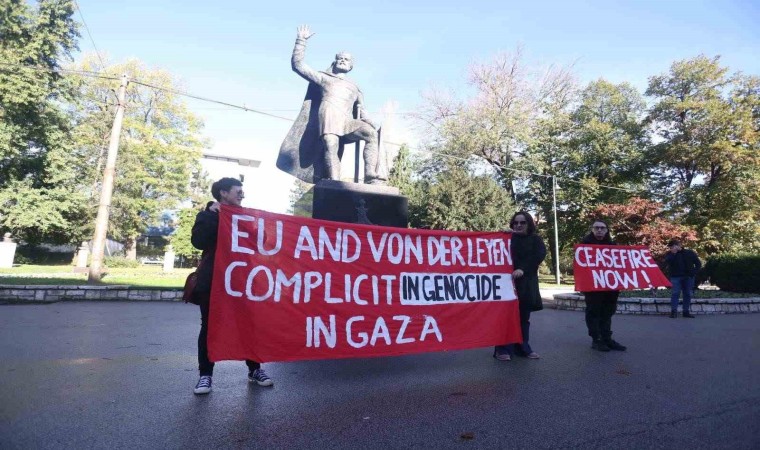 Bosna Hersek’in başkenti Saraybosna’da bir grup gösterici, Avrupa Birliği (AB) Komisyonu Başkanı Ursula von der Leyen’in Bosna Hersek Devlet Başkanlığı Konseyi üyeleriyle görüştüğü binanın önünde toplanarak, "AB ve Von der Leyen, Gazze’deki soykırımın suç ortağı" yazılı pankart açtı.