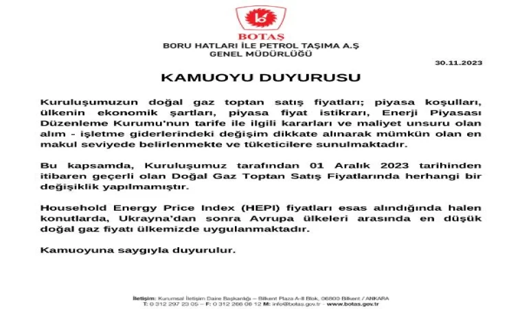 Şirketin sosyal medya hesabından yapılan açıklamada, "Kuruluşumuzun doğal gaz toptan satış fiyatları; piyasa koşulları, ülkenin ekonomik şartları, piyasa fiyat istikrarı, Enerji Piyasası Düzenleme Kurumu'nun tarifeyle ilgili kararları ve maliyet unsuru olan alım-işletme giderlerindeki değişim dikkate alınarak mümkün olan en makul seviyede belirlenmekte ve tüketicilere sunulmaktadır. Bu kapsamda, kuruluşumuz tarafından 1 Aralık 2023 tarihinden itibaren geçerli olan doğal gaz toptan satış fiyatlarında herhangi bir değişiklik yapılmamıştır. Household Energy Price Index (HEPI) fiyatları esas alındığında halen konutlarda, Ukrayna'dan sonra Avrupa ülkeleri arasında en düşük doğal gaz fiyatı ülkemizde uygulanmaktadır" denildi. (DHA)