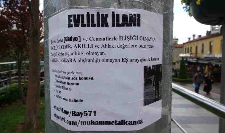 Atatürk Alanında bir direğe yapıştırılan ’Evlilik ilanı’ yazısı görenlerin ilgisini çekiyor. A4 kağıdı büyüklüğündeki ilanda “Derin Devlet (Gladyo) ve cemaatlerle ilişiği olmayan, dürüst, cesur, akıllı, ve ahlaki değerlere önem veren, sosyal medya bağımlılığı olmayan, alkol ve sigara alışkanlığı olmayan eş arayışım söz konusu” bilgileri yer alıyor. Yazının devamında şahıs kendi özellikleri ile ilgili olarak ise "Kendimi özetlemek gerekirse; siyasi adaylıklar söz konusu, yüksek lisans mezunu, sporlar eğitmeni, yaş 41, küfflarla savaş halinde” ifadelerine yer verdi.