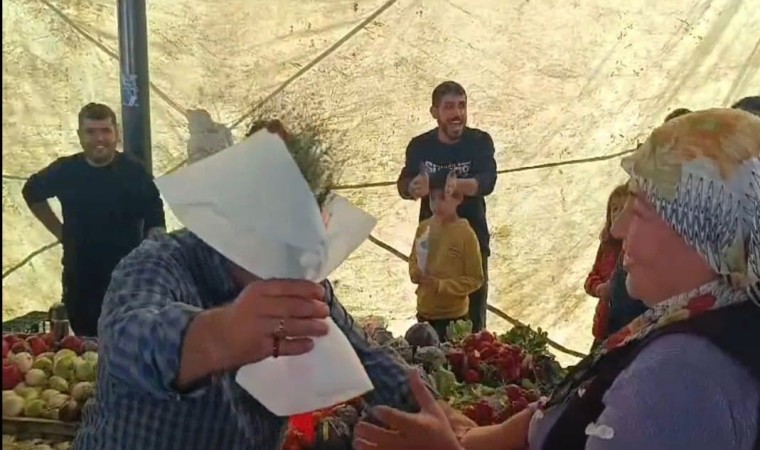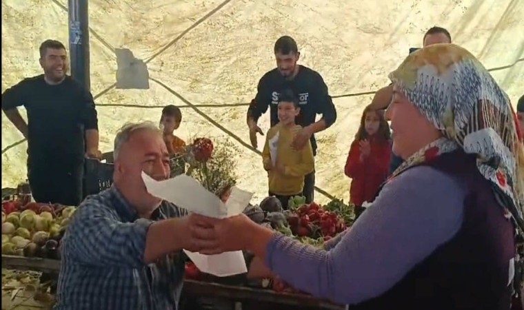 Adananın İmamoğlu ilçesinde pazarcı esnafı Adnan Kılıç (55) eşine sürpriz yapıp pazarda evlilik yıldönümü kutladı.