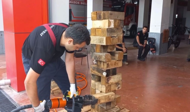 Düzce Belediyesi İtfaiye Müdürlüğü, 24 saat esasına dayalı çalışma sistemi içinde yalnızca meydana gelen olaylara müdahale etmekle kalmıyor, personelin sürekli olarak kendini geliştirmesi amacıyla çeşitli organizasyonlar da düzenleniyor. İtfaiye Hizmet Binası’nda teşkilatın müsait olduğu zamanlarda arama kurtarma cihazlarının hassas kullanımını geliştirme oyunları oynanırken, ekiplerin aniden gelişen olaylara karşı organize olma hızı, hassas kurtarma çalışmaları için denemeler, destekleme takozları ve ayırıcı, kesici ile denge, jenga oyunları düzenleniyor.