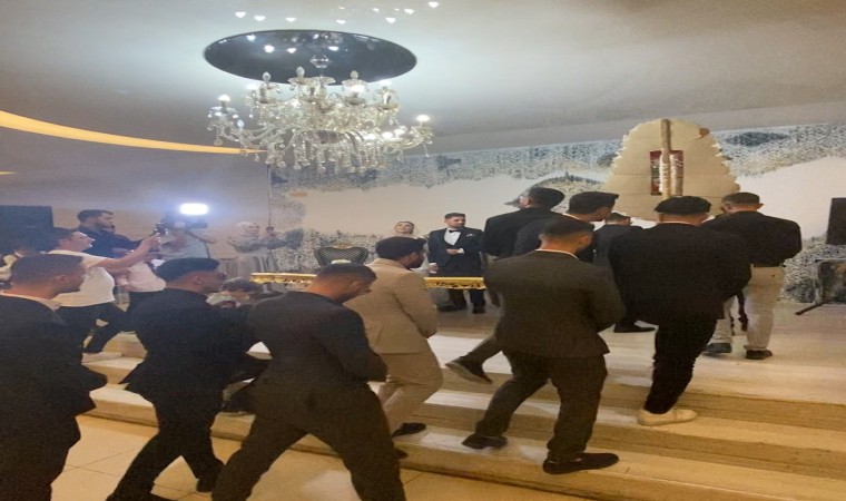 VAN (İHA) – Van’ın Edremit ilçesindeki bir düğünde damadın arkadaşlarının cenazeye gider gibi yakalarına damadın fotoğrafını takıp çelenkle düğün salonuna girmesi herkesi şaşırttı.