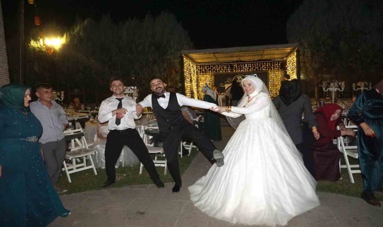 Çiftin ulaştıkları salonda kıyılan nikahın ardından düğünü yapıldı. Pasta kesimiyle başlayan düğünde çift ve davetliler, gönüllerince oynayarak dans etti.