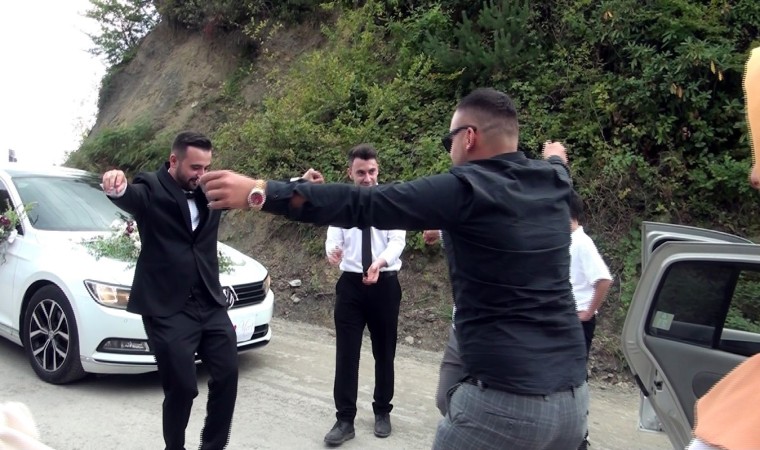 Damadın başka bir arkadaş grubu da, otomobil ile gelin konvoyunun önünü keserek, damadı araçtan indirdi. Gençler, oyun havaları eşliğinde bir süre damat ile birlikte yol ortasında oynadıktan sonra konvoyun geçişine izin verdi.