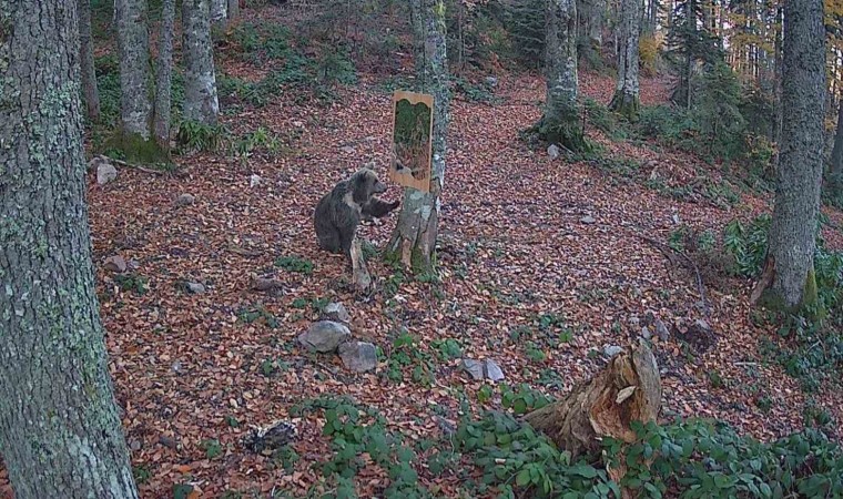 Ormana ayna konularak yapılan çalışmada, yaban hayvanlarının ayna karşısında verdikleri tepkiler ve davranışları yüzleri güldürdü. Özellikle aynada kendini gören ayının yaşadığı şok dikkatleri çekti.