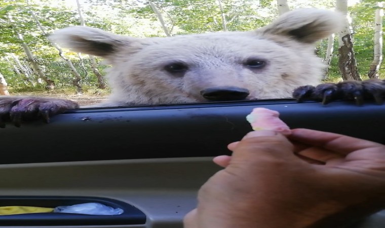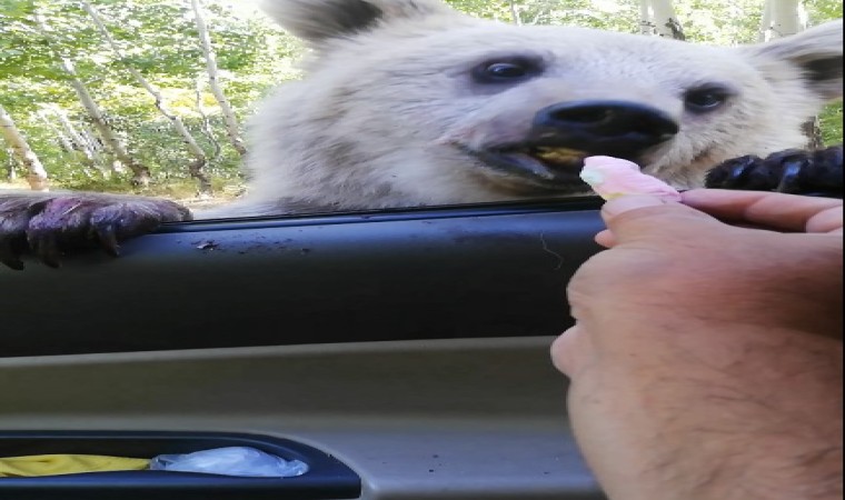 Bitlis’in Tatvan ilçesinde yer alan Nemrut Krater Gölü’nü ziyaret eden vatandaş, aracına yaklaşan bozayıya şeker ikram etti.