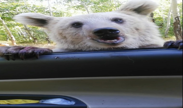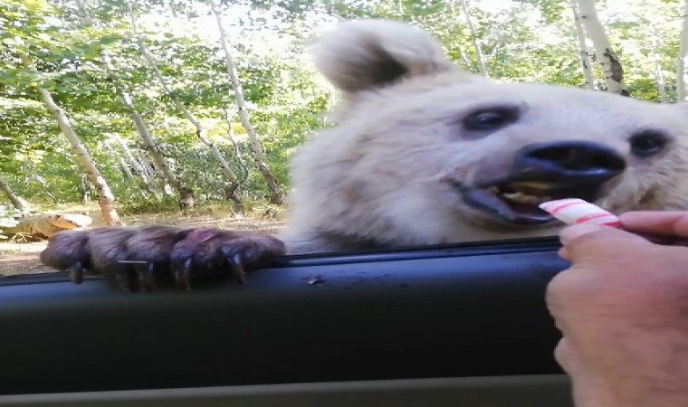 Ahlat’tan gelip Nemrut Krater Gölü’nde yaşayan ayıları ziyaret eden Asım Araboğa isimli vatandaş, aracına yaklaşan bozayıya aracının camını açarak şeker ikram etti. İki ayağının üstüne kalkan ayının başını aracın camından içeri sokarak şekerleri afiyetle yemesi ilginç görüntüler oluştururken, görüntüde ayının şekerleri yedikten sonra pençesini kaldırıp selam verir gibi yapması ise izleyenlere tebessüm ettirdi.