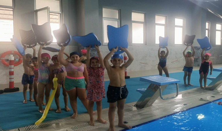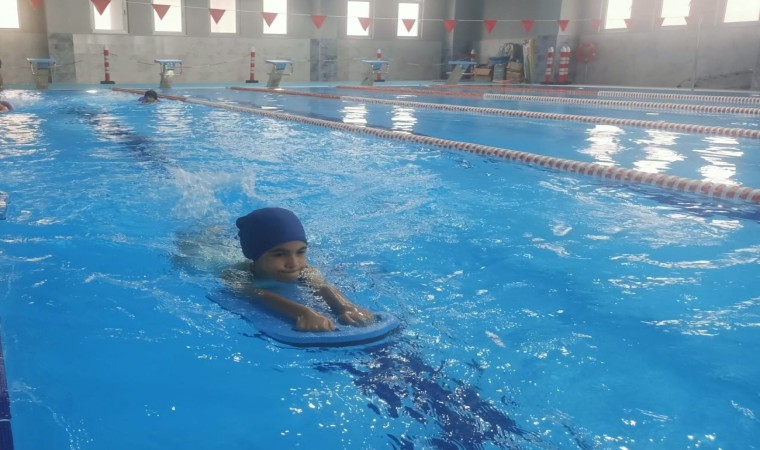 Aydın’ın Bozdoğan ilçesinde faaliyete geçen yarı olimpik yüzme havuzunda eğitim gören çocuklar hem eğleniyor hem de yüzme öğreniyor.