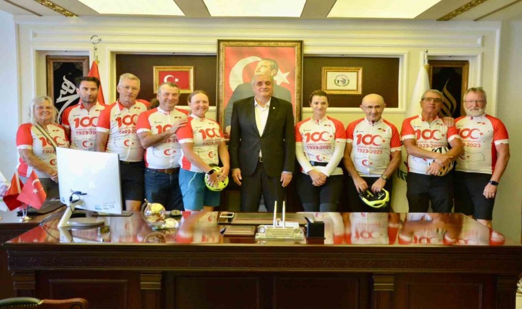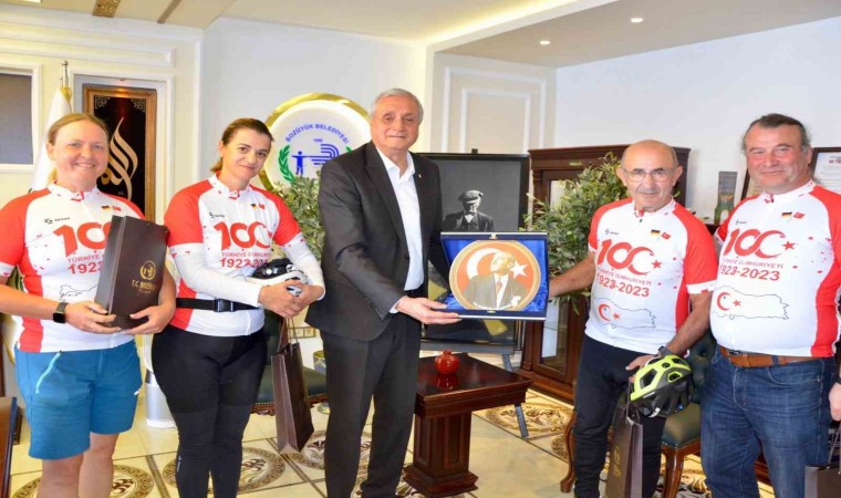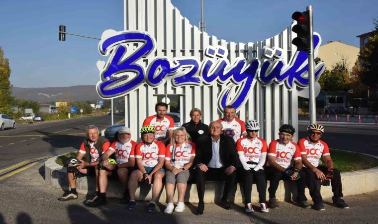 Almanya’nın Köln şehrinde yaşayan Köln Türk Alman Dostluk Derneği üyelerinden 4’ü Alman, 5’i Türk vatandaşı olmak üzere 9 kişiden oluşan bisikletli bir grup, Türkiye Cumhuriyeti’nin kuruluşunun 100’üncü yıl dönümü vesilesiyle, Selanik’te Atatürk Evi’ni ziyaret ederek başladıkları yolculuklarında Bozüyük’e geldi. Bisikletli grubu Adliye binası önünde ‘hoş geldiniz’ diyerek karşılayan Başkan Bakkalcıoğlu misafirleri ile makamında bir araya geldi. Burada misafirleri ile bir süre görüşerek sohbet eden Başkan Bakkalcıoğlu gruba gerçekleştirdikleri bu anlamlı etkinlik ve ziyaretleri nedeniyle teşekkür ederek “yolunuz açık olsun” dedi. Grup adına konuşan Tayfun Keltek, “Burada amacımız Türkiye Cumhuriyeti’nin kuruluşunun 100. yıl dönümü vesilesiyle, bu cumhuriyetimizi onurlandırmak, cumhuriyetimizin önemini vurgulamaktır” dedi. Ardından Bozüyük hakkında yapılan sohbette bisikletli grup Bozüyük’ü çok beğendiklerini belirterek, “Öncelikle burada bizleri misafir ettiğiniz için çok teşekkür ederiz. Biz Almanya’da yaşayan Türkler olarak, ülkemizin çağdaş olması ve gösterdiği gelişmeler bizim için çok önemli. Bozüyük’te çağdaşlığın, çağdaş düşüncenin ne kadar güzel işlere imza atabileceğini çok etkili bir proje üzerinden gördük. Bu tramvay projesi bizi o kadar çok etkiledi ki şu an dünyada geçerli sürdürülebilir projeler, çağa uyumlu projeler, tamamen yerli bir üretim, tamamen inovasyona dayalı bir proje. Bizim için bir güzel yanı da kadınların vatman olarak çalışması. Bunu Bozüyük’te görmek Almanya’da yaşayan Türk olarak bizleri gururlandırdı. Bozüyük bizim hafızamızda modern bir kent olarak yer etti. Selanik’ten Anıtkabir’e büyük bir coşku ile gidiyoruz. Atatürk’ün aşkı ile yolcuğumuzu sürdürüyoruz, ona bir kez daha minnettarız” dediler. Ziyaretin sonunda Başkan Bakkalcıoğlu misafirlerine plaket takdiminde bulunarak Türk Bayrağı ve Nutuk hediye etti.