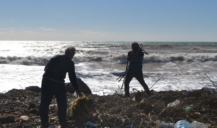 Mersin’in Bozyazı ilçesinde etkili olan sağanak yağış sonrasında vatandaşlar, sel sularıyla denize taşınan ağaç ve dalları yakılmak üzere topladı.