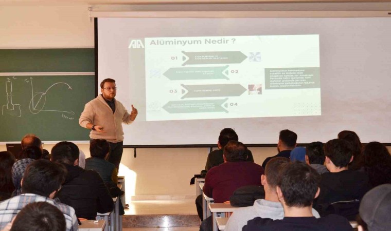 Mühendislik Fakültesi’nde düzenlenen etkinlikte alüminyum alaşımlar, alüminyumun kullanım alanları, avantajları, ekstrüzyon prosesi ile alüminyum profil üretimi, kalite kontrol, alüminyumun geri dönüştürülebilirliği ve sektöre sağladığı avantajlar gibi önemli konular işlendi.