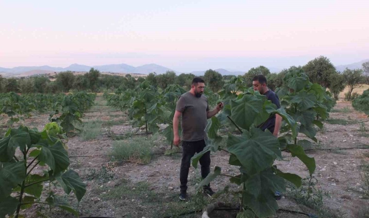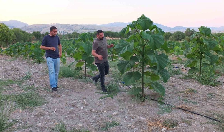Yıllardır Almanya’da çalışan Kul Muhammet Derin tarafından memleketi olan Dinar ilçesine bağlı Haydarlı beldesinde 30 dönüm araziye pavlonya ağacı dikildi. Toplam bin 200 adet dikilen ağaç kamera sistemi ile 24 saat izleniyor. Arkadaşı Murat Tosun ile Haydarlı beldesine gelen Derin dikimini yaptıkları ağaçtan 7 yıl sonra ilk hasadı yapacaklarını ifade etti. Birçok sektörde pavlonya ağacının kullandığını ifade eden Derin, “Bakımı güzel olduğu zaman 7 yılda 15-20 metreye kadar büyüyebilen bir ağaç. Bu ağacın çok farklı özellikleri var. Bizim bu ağaçları dikmemizdeki amacımız tabi ki kereste. Ama bunun yanında hava kirliliğini de önlemek. Biz bu ağaçlarla yaklaşık 2 yıldır ilgileniyoruz. Bu ağacın özelliklerini yetiştirirken ne istediğini biliyoruz. Ağacın hekimini Haydarlı’ya yapmamızın da ana sebebi toprağımız özlediğim için kendi yurduma bir yenilik getirip istihdam oluşturmak istedim. Bu ağacın ekimini yapan tek kişi biziz” diye konuştu.