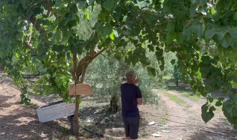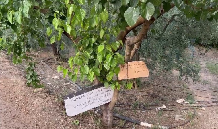 Bursa’da çiftçilik yapan bir vatandaş, bahçesinde bulunan dut ağacının altına ’Bu ağaçtan dut yemek helal, yememek haram’ yazdı.