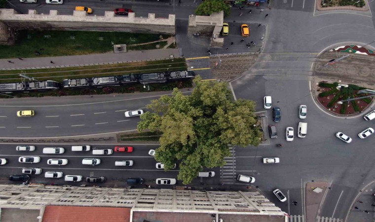 Kayseri’de, şehrin en işlek caddesinin orta refüjünde bulunan 350 yıllık çınar havadan görüntülendi.