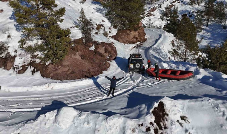 Profesyonel sporcular ve doğaseverlerden oluşan grup, 1800 rakımlı Öğdem Köyü’nde rafting botlarını araçlarının arkasına bağlayarak karada adrenalin dolu anlar yaşadı. Çoruh Nehri’nde şortla suya giren grup, bu kez soğuktan korunmak için montlarıyla bota bindi. Küreklerini suyun akışına göre kullanan raftingçiler, bu kez kar üzerinde kürek çekti.