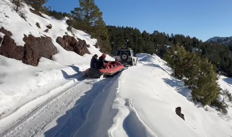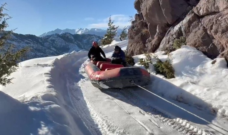 Artvin’in Yusufeli ilçesinde bir grup adrenalin tutkunu arkadaş, yıllarca Çoruh Nehri’nde kürek çektikleri botlarını bu kez bin 800 metre rakımda kar üzerinde ’Karrafting’ yaparak kullandılar.