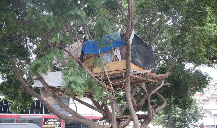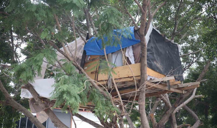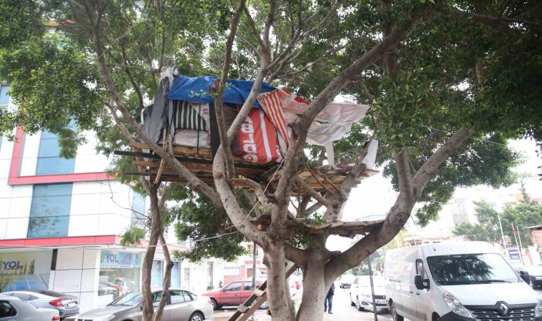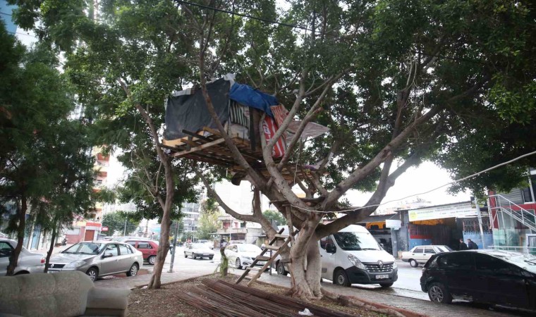 Mersin’in merkez Akdeniz ilçesine bağlı Barış Mahallesinde bulunan bir inşaatın bekçisi, geceleri yatmak için yakındaki bir ağacın üstüne ev yapmaya karar verdi. Tahtadan ağacın tepesine ev yapmaya başlayan bekçi, uzun uğraşlar sonucunda evi tamamlamayı başardı. Kendi evi olmasına rağmen ara ara ağacın üstünde yaptığı tahta evde kaldığı iddia edilen bekçi, görenlerin taktirini topluyor. Bekçinin işten ayrılmasından dolayı bugünlerde boş kalan evi gören vatandaşlar ise şaşkınlıklarını gizleyemiyor. Bölgeden geçen vatandaşlar evi gördüklerinde dönüp bir kez daha bakıyor.