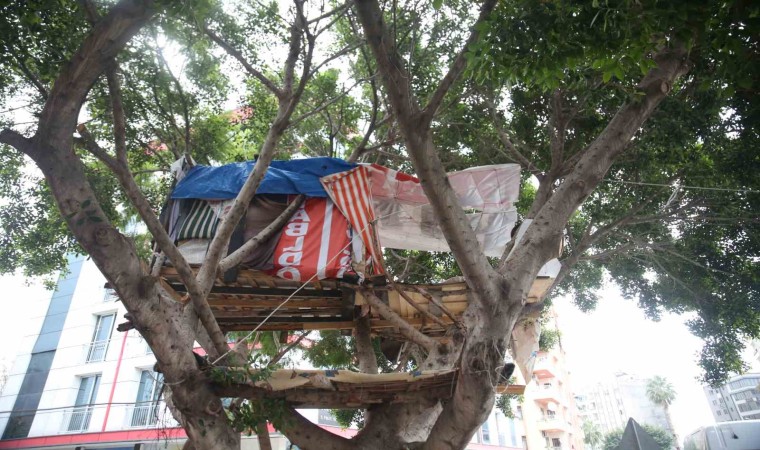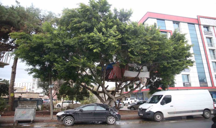 Mersin kent merkezinde bir ağacın tepesine yapılan tahta ev gören herkesi şaşırtırken, oradan geçenler dönüp bir daha bakıyor.