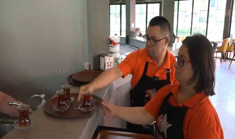 Hijyen, servis ve davranış biçimleri eğitimlerinin meslek hayatına atılan Down sendromlu gençler, aldıkları siparişleri kendilerine özgü sevecen ve sempatik tavırlarıyla müşterilere servis ediyor.