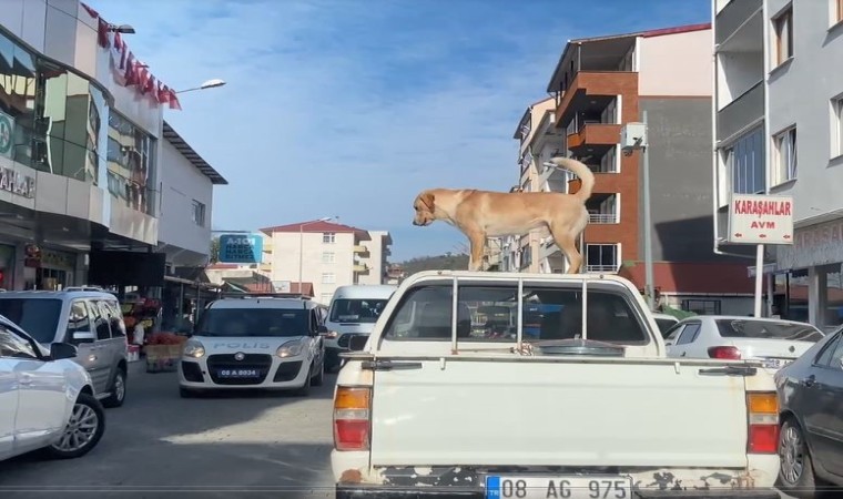 Artvin’in Kemalpaşa ilçesinde sahibinin kamyonetinin tavanında seyahat eden köpek ilçenin maskotu haline geldi.