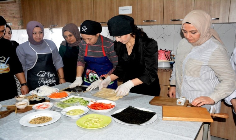 Tarihi Yeni Han’da kursiyerler, Yiyecek ve İçecek Hizmetleri Öğretmeni Emine Eserli ve Aşçılık ve Pastacılık Öğretmeni Merve Boz eşliğinde Uzak Doğu mutfağının en önemli yemeklerinden biri olan sushi ile Orta-Kuzey Amerika ülkesi Meksika’ya ait taco yemek tarifini yaptılar. Kursiyerler yaptıkları sushi ve taco yemeğini daha sonra afiyetle yedi. Aşçı yardımcılığı kursuna gündüz 7, akşam 7 kursiyer, pastacılık kursuna ise 6 kursiyer katılıyor. Yiyecek ve İçecek Hizmetleri Öğretmeni Emine Eserli, “Şehzadeler Halk Eğitim Merkezi olarak Yeni Han’da yiyecek içecek alanıyla ilgili farklı kurslar veriyoruz. Verdiğimiz kurslardan bazıları aşçı yardımcılığı, pastacılık kurslarıdır. Gündüz burada pastacılık kursu düzenleniyor. Aynı zamanda garsonluk kurslarımız da var. Aşçı yardımcılığı kurusunda hem Türk hem de Dünya mutfağından örnekler sergiliyoruz. Sushi, taco gibi farklı yiyecekler yapıyoruz. Türk mutfağında ise ülkemizin yöresel yemeklerini yapıyoruz. Aynı zamanda Osmanlı mutfağının lezzetlerini burada öğretiyoruz. Böylece kursiyerlerimiz hem eğitim alıyor hem meslek sahibi oluyor hem de Milli Eğitim Bakanlığı onaylı belge sahibi olmuş oluyorlar” diye konuştu.
