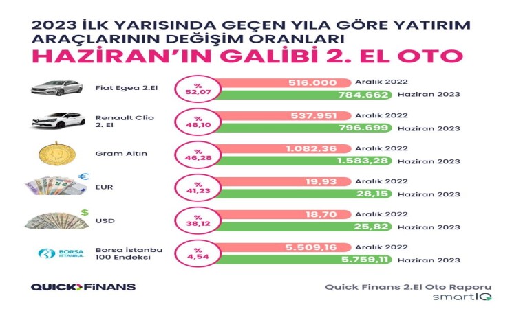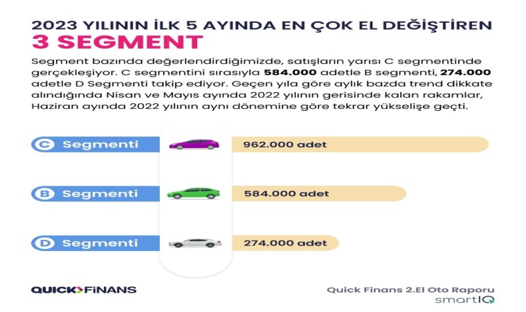 Quick Finans’ın yayınladığı 2. El Oto Raporu’nun 2023 yılı ilk 6 ayının verilerinin yer aldığı güncel sayısında, sektöre dair önemli trendler ve değişimler mercek altına alındı. SmartIQ iş birliği ile hazırlanan raporda gerçekleşen satış rakamları, fiyat trendleri ve satış hızı değişimleri değerlendirildi.