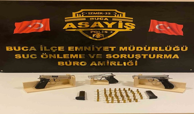 Buca İlçe Emniyet Müdürlüğü ekipleri, ilçede yürütülen çalışmalar kapsamında hırsızlık suçundan 23 yılın üzerinde hapis cezasıyla aranan U.Ç. ve silah ticareti yapan Ş.E.’nin izini sürdü. İki şüpheli de belirlenen adreslerde kıskıvrak yakalanarak gözaltına alındı. Silah ticareti yaptığı belirlenen zanlının adresinde yapılan aramalarda ise 3 ruhsatsız tabanca, 2 şarjör ve 80 fişek ele geçirildi.