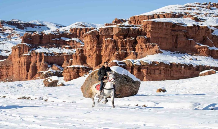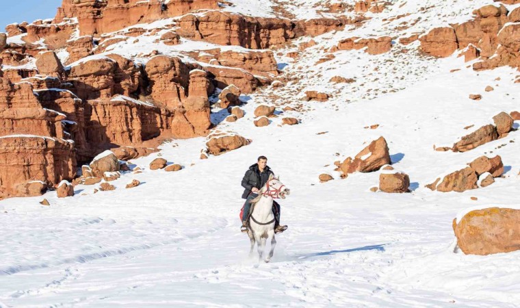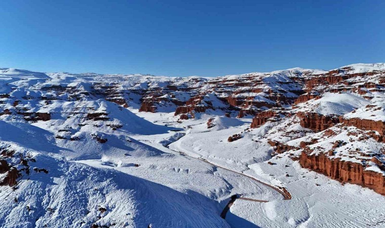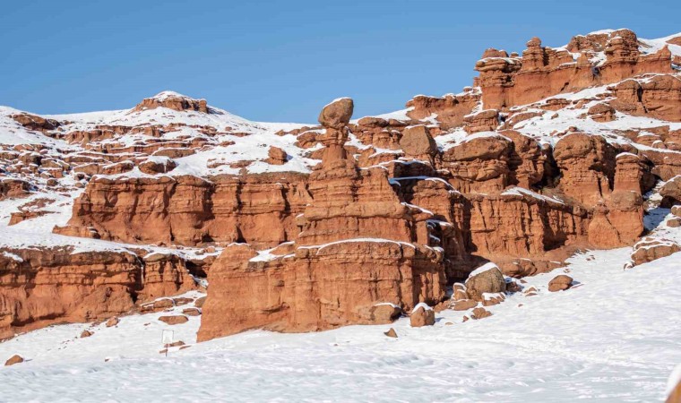 Erzurum’un “ Kırmızı Periler Diyarı” Narman Peri Bacaları, kışın da eşsiz kırmızı manzarası ile beyaza büründü.