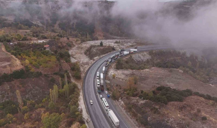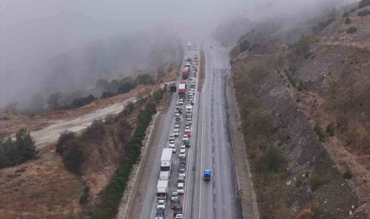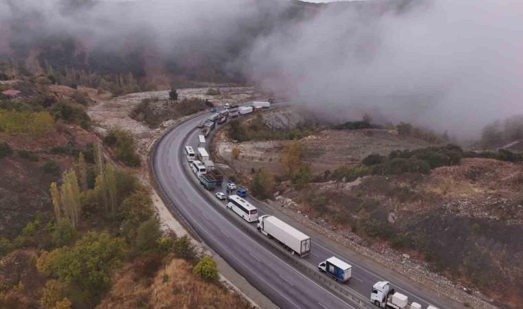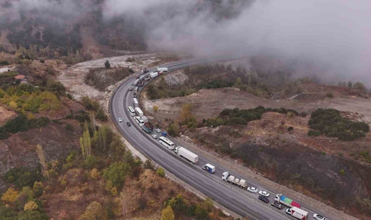 Burdur-Antalya Karayolu’nda yağış nedeniyle kayganlaşan yolda virajı alamayan tırın bariyerlere çarparak makaslaması sonucu yol trafiğe kapandı, kilometrelerce oluşan araç kuyruğu havadan görüntülendi.