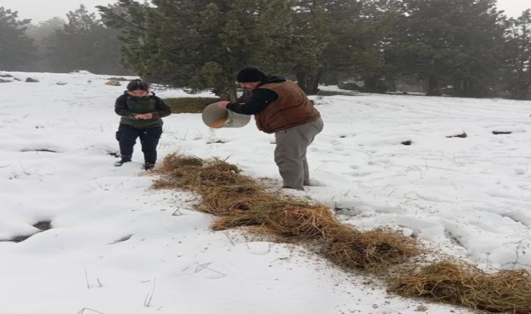 Burdur’da yoğun kar yağışının etkili olduğu ve kar kalınlığının yarım metreyi bulduğu Eşeler Yaylası’nda Doğa Koruma ve Milli Parklar (DKMP) ekipleri, yaban hayvanları ve kızıl geyikler için yem bırakıyor.