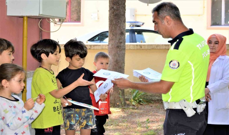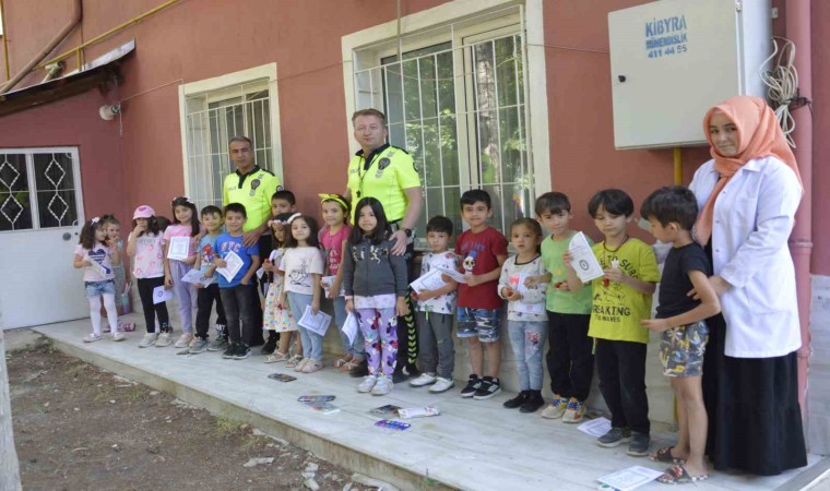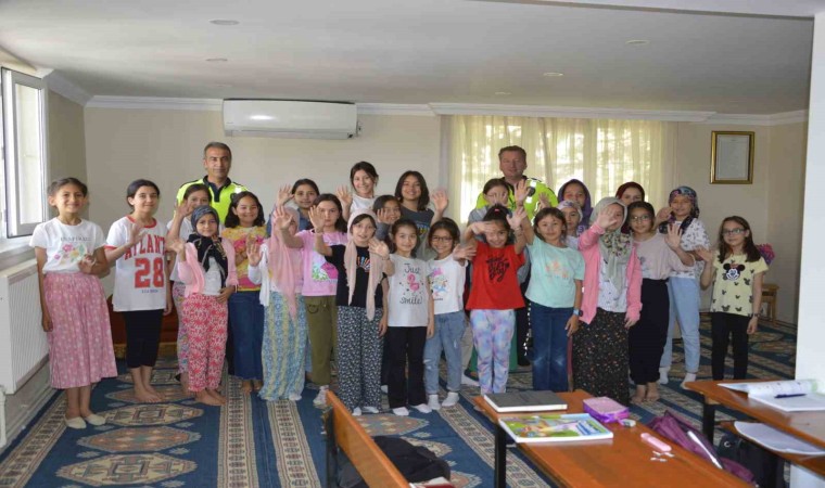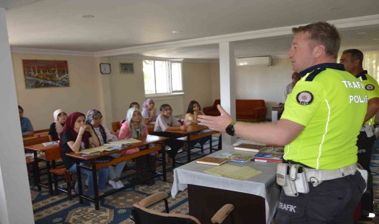 Burdur’un Gölhisar ilçesinde İlçe Emniyet Müdürlüğüne bağlı Gölhisar Trafik Tescil ve Denetleme Büro Amirliği’nde görevli trafik polisleri tarafından camilerdeki yaz Kur’an kurslarında trafik eğitimi verildi.