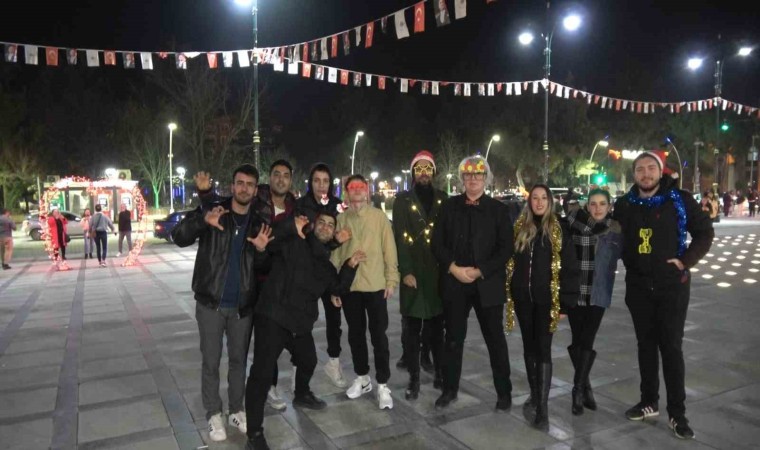 Kıyafetine eklediği ışık, noel şapkası ve yıldızlı gözlükleriyle farklı bir kombin yapan Görsel İletişim Tasarımı öğrencisi Mehmet Yağız, “Geçen senede yılbaşını bu şekilde coşkulu kutlamıştık ama bu kadar konsept bir şekilde giyinmemiştik. Bu sene de bir farkındalığımız olsun istedik. Görsel İletişim Tasarımı okuyoruz sonuçta. Böyle bir kombin yaptım ve dışarı çıktık. Yılbaşını coşkuyla kutladık. İnşallah sağlık, huzur ve mutluluk dolu bir yıl bizi bekler.” ifadelerini kullandı.