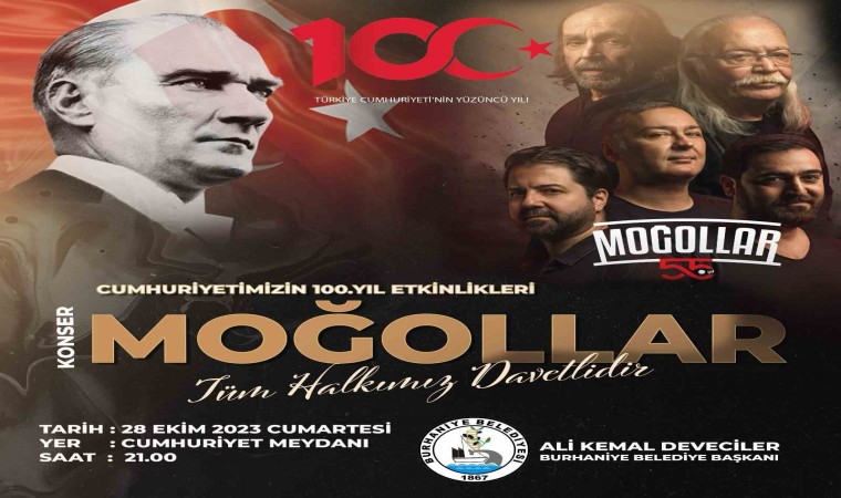 28 Ekim’de öğle saatlerinde yapılacak çelenk sunma töreninin ardından akşam 21.00’de Burhaniye Belediyesi tarafından Cumhuriyet Meydanı’nda ücretsiz halk konseri düzenlenecek. Ülkeni köklü müzik gruplarından olan Moğollar, Cumhuriyet’in 100. yılı kutlamaları için Burhaniye’de sahne alacak. Sanatta 55. yılını kutlayan sevilen müzik grubu Moğollar ile Burhaniye 29 Ekim Cumhuriyet Bayramı coşkusunu hep birlikte yaşayacak.