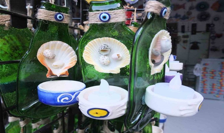 Ören Çarşısında hediyelik eşya satışı yapan 1 çocuk annesi Rüya Yıldız’ın atık şişelerden yaptığı mumluklar ilgi gördü. Yıldız, şişelerin preslenerek mumluk haline getirildiğini söyledi. Şişeleri geri dönüşüm firmalarından satın aldıklarını anlatan Rüya Yıldız, “10 yıldan beri şişeleri alarak presleyip mumluk haline getiriyoruz. Bunlar Ören’e gelen konukların ilgisini çekiyor. Tanesini büyüklüğüne 25 ile 160 lira arasında satıyoruz” dedi.