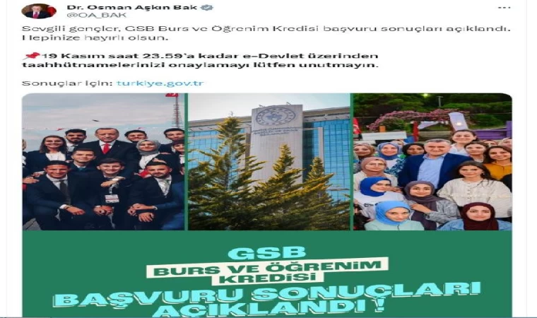 Bakan Bak, sosyal medya hesabından yaptığı açıklamada, "Sevgili gençler, GSB burs ve öğrenim kredisi başvuru sonuçları açıklandı. Hepinize hayırlı olsun. 19 Kasım saat 23.59'a kadar e-Devlet üzerinden taahhütnamelerinizi onaylamayı lütfen unutmayın. Sonuçlar için: http://turkiye.gov.tr" dedi.