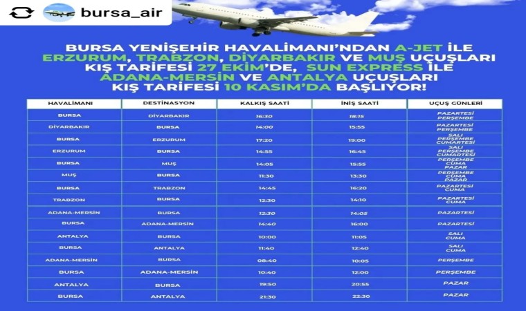 Sosyal medyada hesabından açıklamada bulunan 27. Dönem AK Parti Bursa Milletvekili Mustafa Esgin, Bursa Havalimanı’nda kış tarifesinin 27 Ekim’de başlayacağını söyledi. Esgin, "Bursa Havalimanımızda Kış Tarifesi Uygulaması 27 Ekim’den itibaren başlıyor. Yeni dönemde Bursa’dan 6 havalimanı ve 7 ilimize karşılıklı direkt uçuşlar başlamış olacak. Bursa’mıza ve Bursa Havalimanımıza inanıyoruz" dedi.